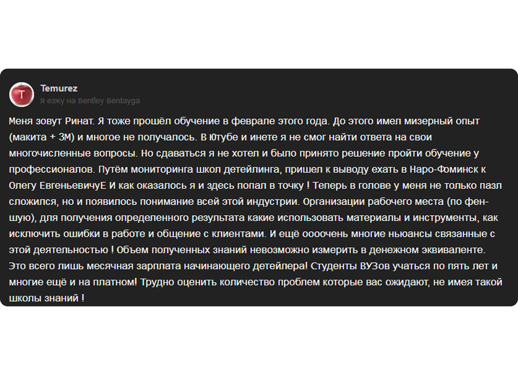 Обучение состоит из 5-дневной программы, в которую входит получение и глубокое усвоение не только теоретических и практических знаний и навыков, необходимых детейлеру, но и познание многих секретов и хитростей, которые приходят только с опытом. Всё это Вы увидите своими глазами и научитесь делать.